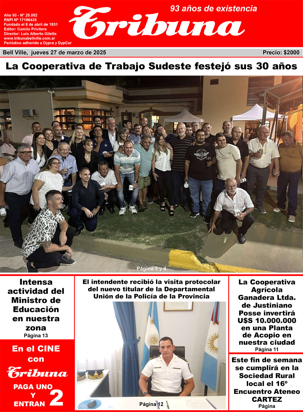 El jueves de la semana anterior se realizó el acto conmemorativo del trigésimo aniversario de la provisión de los servicios de agua potable y cloacas para Bell Ville y una vasta zona de la provincia de Córdoba por parte de la Cooperativa de Trabajo Sudeste Limitada. Durante la convocatoria, socios fundadores y autoridades destacaron el esfuerzo realizado para transformar este servicio público en la región, además del anuncio de una importante inversión para la infraestructura, cual es el cambio de un tramo del acueducto Marcos Juárez - General Roca.