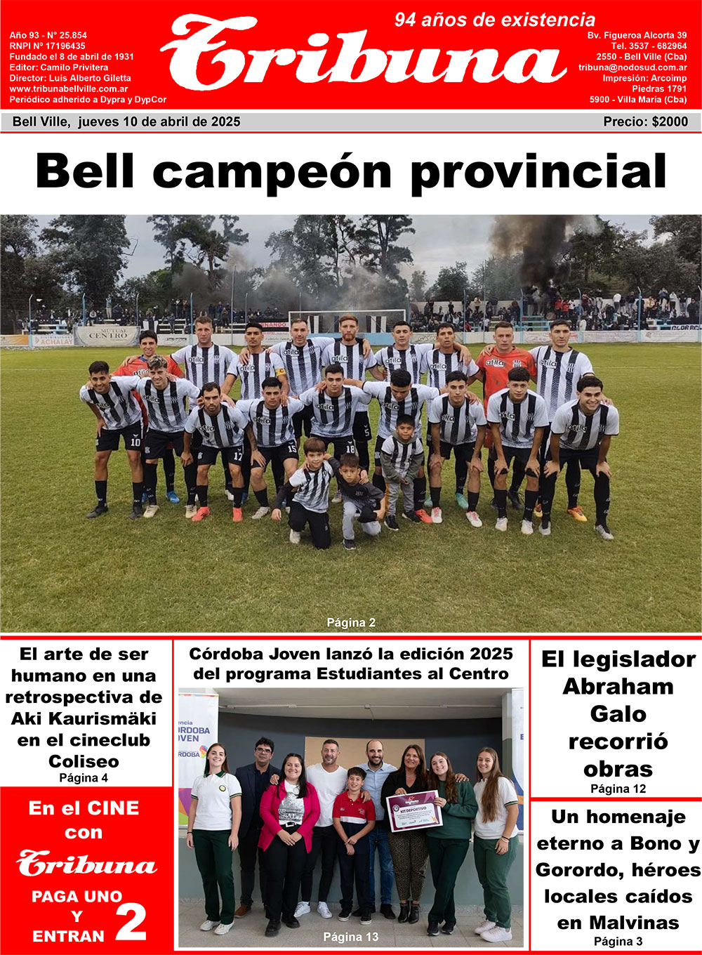 El domingo y en Vicuña Mackenna, el club Atlético y Biblioteca Bell se consagró Campeón del Torneo Provincial de Clubes de Primera División "75 Aniversario Liga Regional de Fútbol de Laboulaye" que organiza la Federación Cordobesa de Fútbol. Luego de empatar los dos partidos de la instancia final en un tanto por bando, el conjunto "albinegro" le ganó por penales (3 a 2) a San Martín de Vicuña Mackenna en el Estadio Parque Centenario de ésa escuadra, ante una multitud que superó las 3.000 personas.