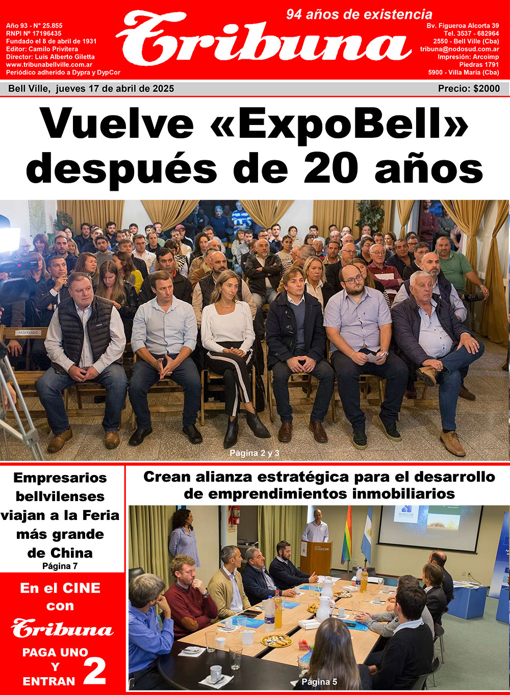 Durante los días 26, 27 y 28 de septiembre y en el predio de la Sociedad Rural de Bell Ville se realizará una nueva edición de la Exposición Rural, Industrial y Comercial "ExpoBell 2025", que marcará el regreso de este evento histórico a la ciudad después de más de 20 años. El anuncio fue confirmado en el marco de una conferencia de prensa realizada en la Sociedad Rural el martes de la semana anterior, en un salón colmado de público conformado por empresarios, productores rurales, representantes de entidades educativas, asociaciones y autoridades municipales encabezadas por el intendente Juan Manuel Moroni.