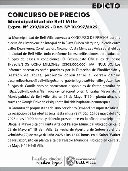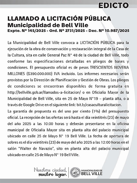 En el sitio web de la Municipalidad y a través del link https://bellville.gob.ar/ova_doc/dec-10980-2025- }promulgacion-ord-2731-2025-y-dec-10987-llamado-a-licitacion-restauracion-casa-de-la-cultura/, están disponibles los detalles de la convocatoria a licitación pública para la obra de conservación y restauración integral de la Casa de la Cultura.