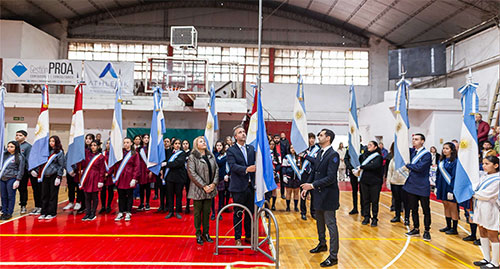 Con el marco musical de la Orquesta Vocacional del Recuentro, el evento contó con la presencia de autoridades y funcionarios municipales, directivos, docentes de establecimientos educativos del medio, delegaciones institucionales, representantes de las fuerzas vivas de la ciudad, abanderados y escoltas.