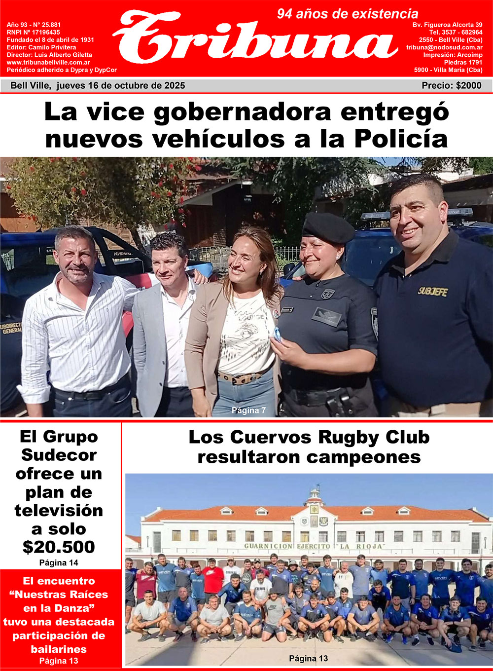Con la finalidad de entregar móviles policiales a distintas comisarías y destacamentos del departamento Unión, el martes estuvo en Bell Ville la vice gobernadora de Córdoba, Myrian Prunotto, acompañada por el secretario de Seguridad Angel Andrés Bevilacqua y el subjefe de la Policía de Córdoba, comisario general Antonio Urquiza, entre otras autoridades de esta fuerza.