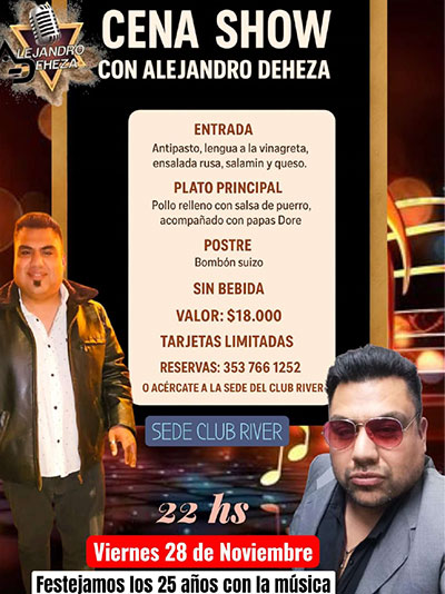 Sábado 28 de noviembre: cena show con Alejandro Deheza.